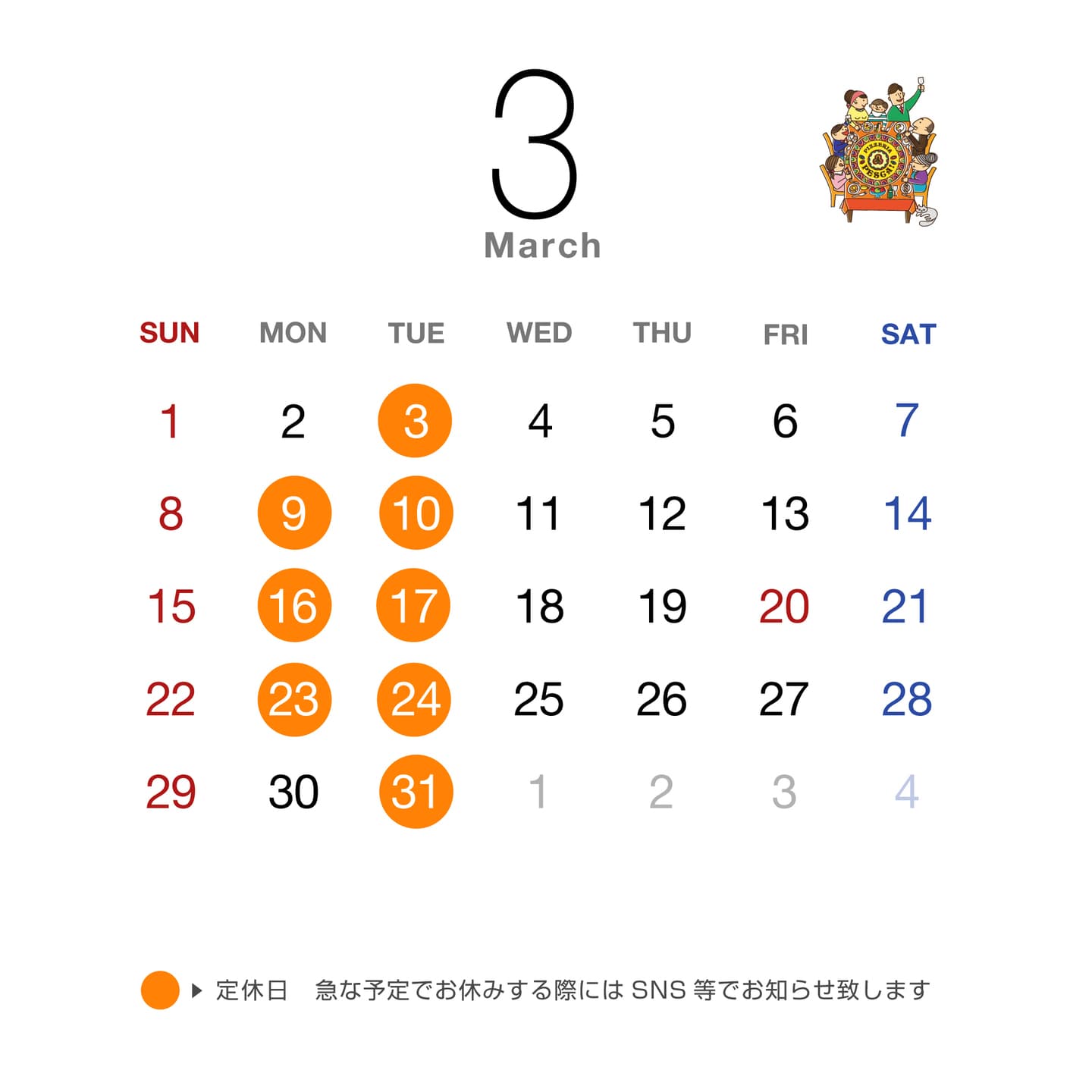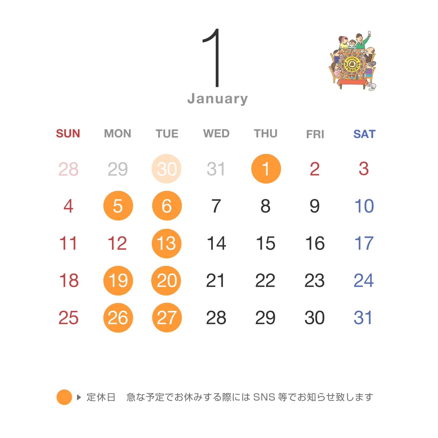 毎週火曜日(祝祭日の場合は振替)+不定休、